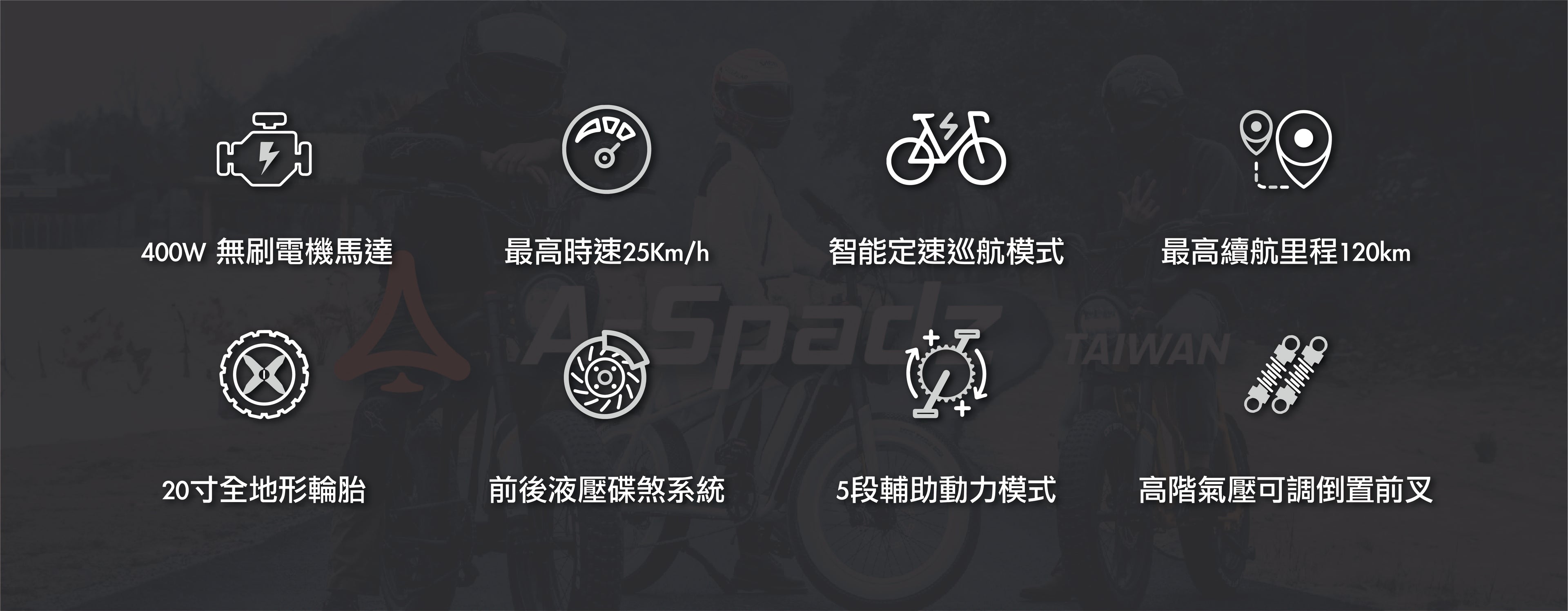 A-Spadz採用倒立式空氣減震前叉,以更高的整體剛性和更靈敏的懸吊反應來改善自行車的操控性。透過預設、回彈、壓力調節,實現最舒適的騎乘體驗